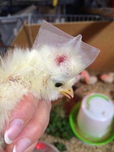 4. Habit- Once a chicken- chick or adult- starts pecking at those crests, it quickly becomes an established behavior. Pin feathers with a splash of blood taste yummy and our tiny crested T-rexes are still cannibals at heart. I like to tape up males with a soft masking or paper tape when they’re in with the girls. I also will tape up female crests, especially frizzles, and particularly when introducing them to a new area or group of birds. For chicks, as soon as I see pecking begin, on go the little dunce caps. I like to use a stronger more adhesive tape with them, as I won’t be taking them off. They’ll fall off when the chick fuzz molts off. I use a medical tape but duct tape will work too. Wrap it around the crest above the eyes and stick it together in a little triangle. Look for the aggressor to cull or move. If you can’t find it, wrap all the crested chicks in the brooder. This will make pecking them unrewarding and hopefully stop the behavior from becoming habitual. If there isn’t enough feather or fuzz for the tape to stick to because the chick is completely scalped, make up a thick paste of flour and water. Use it to stick a cotton ball on the head. You will have to hold it there until the paste dries. It takes a while but stays really well IF you haven’t messed it up by putting a bunch of goo like neosporin on it first. See if they’re too hot or have too much light. Red lights instead of white will dramatically decrease picking. Often, the only red lamps you can find are the 250 watt bulbs from the feed store. These may be too hot for your brooder. I buy the red Exo-Terra reptile 50,100, or 150 watt bulbs on Amazon. It always amazes me how well chicks raised under one of my silkie or araucana broodies do. They almost never pick at each other, feather out faster, and have a much lower illness and death rate. I think this is attributable at least partially to the fact that they have a nice long sleep under mom during the night hours where they neither eat nor drink. Even under the red lamps, the chicks in the brooder munch all night and don’t give their intestines a rest like chicks under a hen do. It’s much worse under a white light. Mom also serves as a jungle gym- watch them jump all over her. When they’re under her for heat, it’s dark, so they won’t pick at each other like they will if they can see each other. True, chicks that are hen raised are not as tame, but there is a real benefit to raising them this way if you have willing hens and a secure area for them to raise their kids.